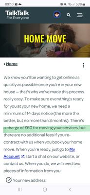 Ah, but (and I've just trialled this) when you actually go through the move, the £60 fee is automatically waived with no indication of a new contract being the result of this. I can see no way in which to reject this so they are making an assumption on my behalf that I wish to start a new contract. That in no way is made clear when you go through the home move process - in fact it looks like a goodwill waiver for being a loyal customer, instead Talktalk are unfairly automatically assuming you will accept a new contract.