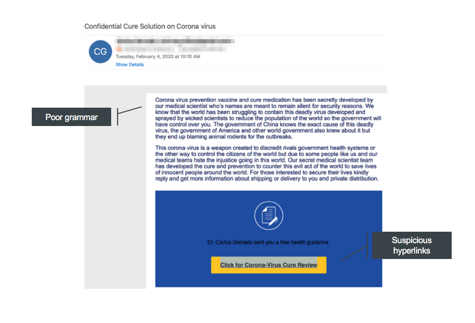 On first glance, this email looks like it’s been sent from a medical specialist, with an informative attachment providing safety tips. However, if you look closer, you can see that there a number of red flags such as poor grammar, the suspicious email address it’s been sent from, and the attachment it’s telling you to download.